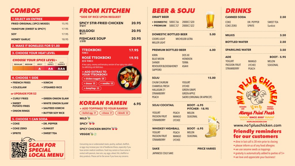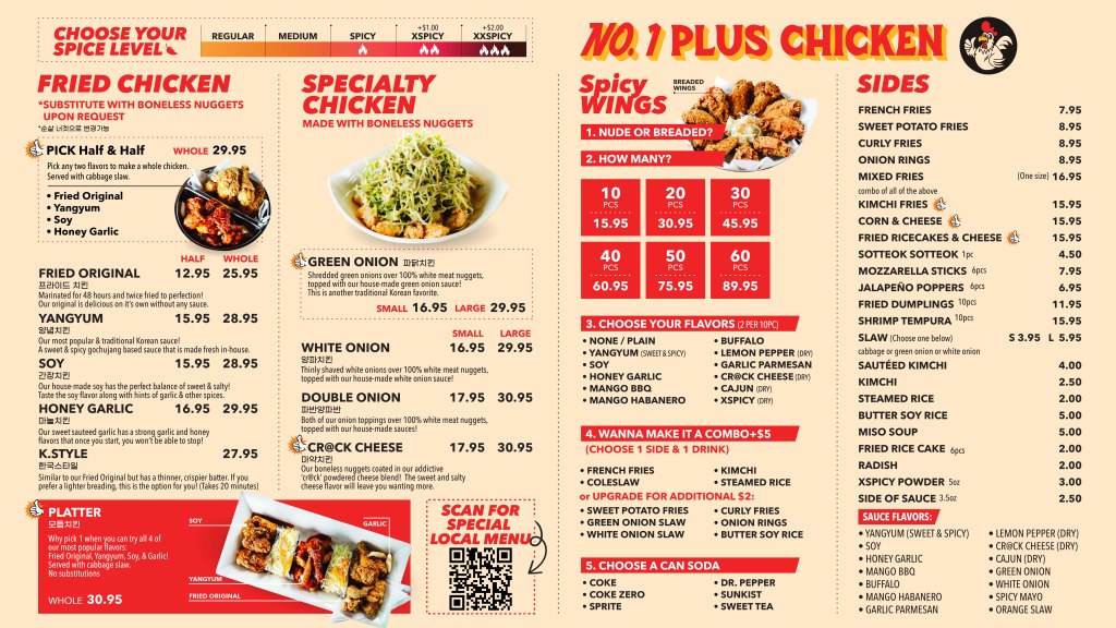 Welcome to No.1 Plus Chicken, where we specialize in KFC (Korean fried chicken)!